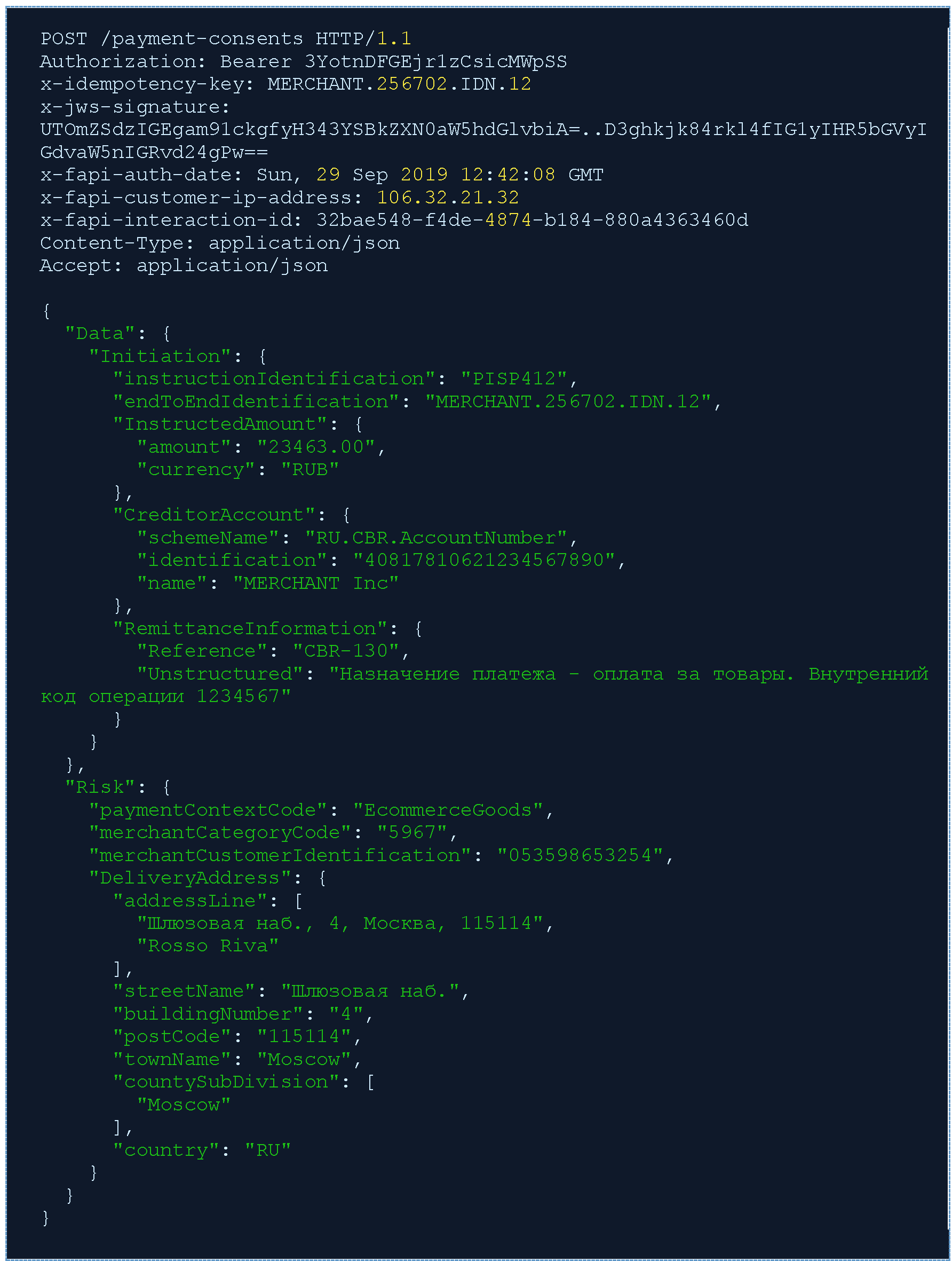 Запрос POST /payment-consents. СППУ присваивает иницирумой платежной инструкции номер (instructionIdentification) PISP412 и создает на стороне ППУ ресурс согласия на проведения платежа вызовом конечной точки POST /payment-consents, указывая идентификаторы ("instructionIdentification": "PISP412", "endToEndIdentification": "MERCHANT.256702.IDN.12"), реквизиты "MERCHANT Inc" и указания дополнительных деталей для оценки рисков платежей в разделе Risk.