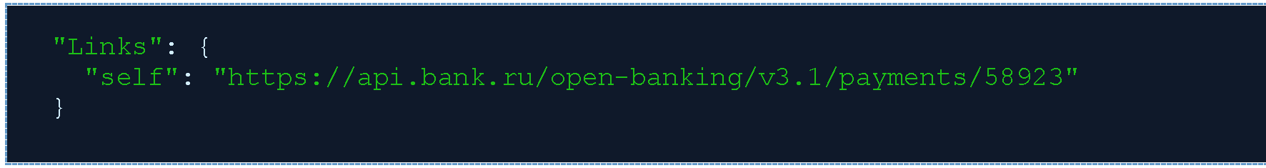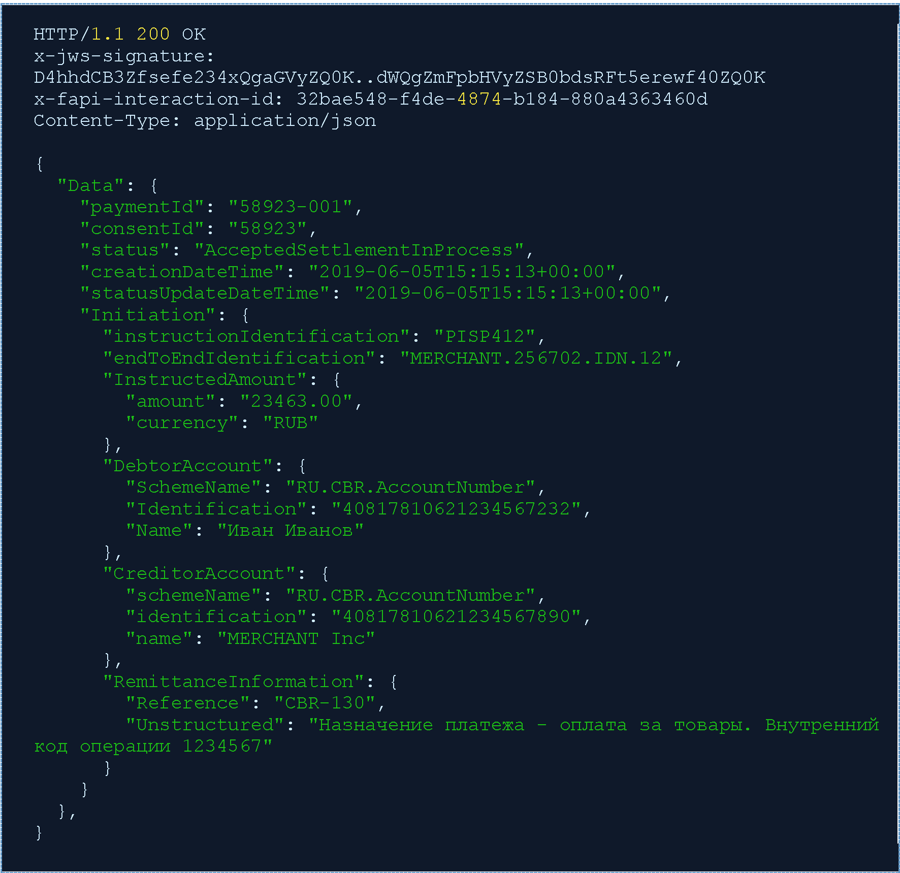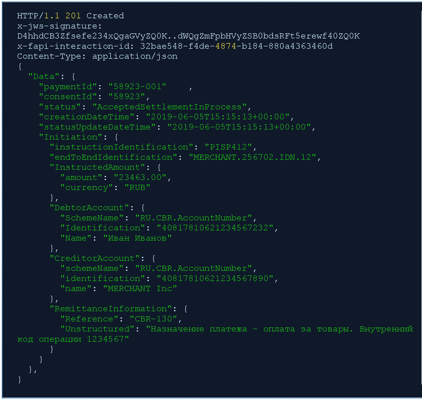 Ответ на POST /payment-consents. ППУ производит обработку (и процесс исполнения) платежа и возвращает СППУ его идентификатор (paymentId) 58923-001.