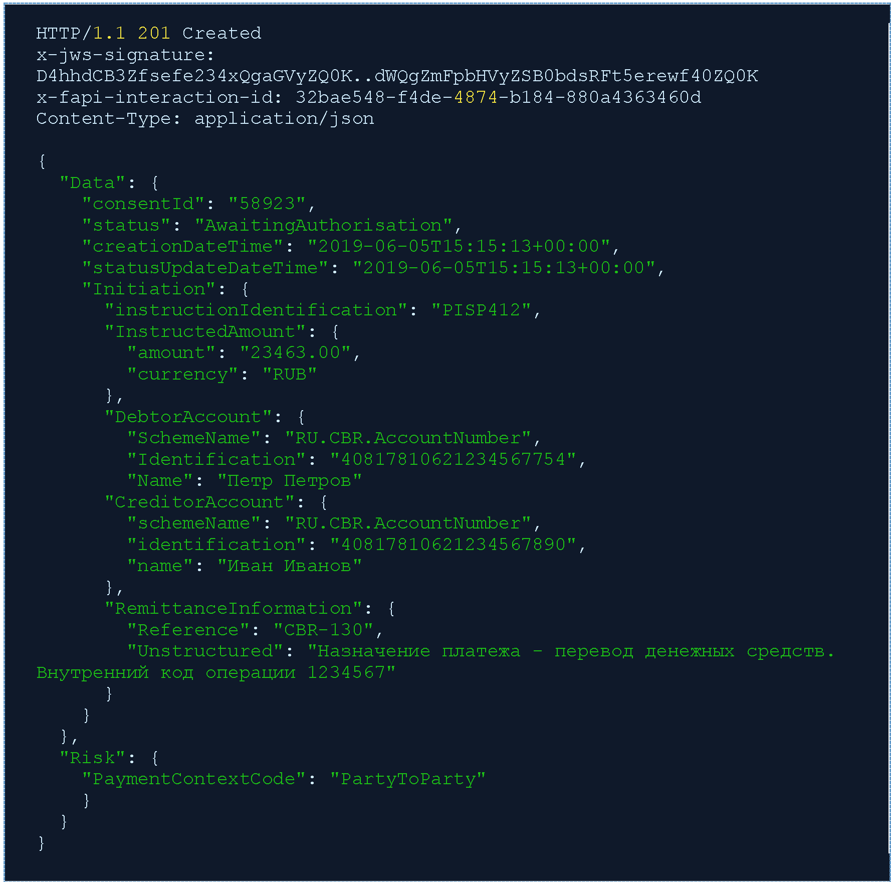 Ответ POST /payment-consents. ППУ производит обработку запроса и возвращает идентификатор согласия (consentId) "58923" со статусом "AwaitingAuthorisation", указав дату создания (creationDateTime) (дата обновления статуса (statusUpdateDateTime) в данном случае идентична дате создания).