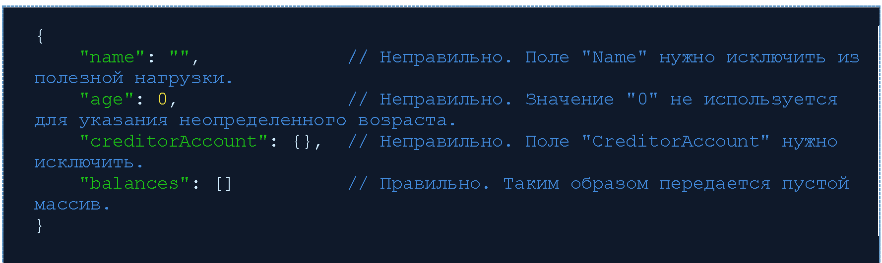 | RU.CBR.Field.InvalidDate | 400 | Указана неверная дата. Например, когда ожидается будущая дата, а указана дата в прошлом или текущая дата. В сообщении можно указать актуальную проблему с датой. Ссылка на недопустимое поле должна быть указана в поле path, а в поле URL может быть ссылка на веб-страницу, объясняющую правильное поведение. |
