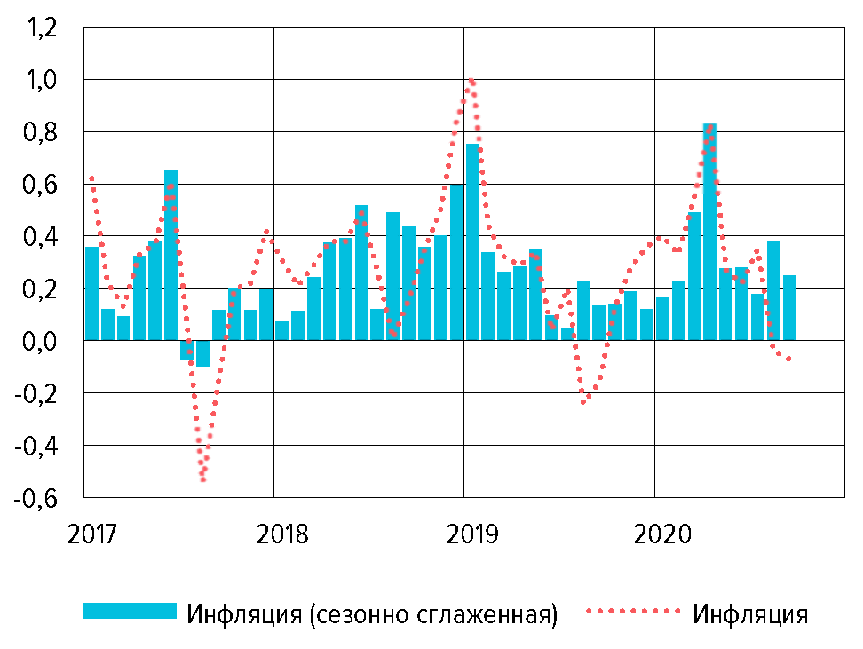 Банк России отреагировал на кардинальное изменение экономических условий переходом к мягкой денежно-кредитной политике, снизив ключевую ставку с 6% до исторического минимума в 4,25% годовых. Такая реакция денежно-кредитной политики потребовалась, чтобы не допустить продолжительного отклонения инфляции вниз от цели (вблизи 4%) и создать условия для более быстрого возвращения экономики к потенциалу ее развития. Таким образом, в отличие от предыдущих лет, когда в основном преобладали проинфляционные риски, в настоящее время Банк России принял меры, чтобы ограничить дезинфляционные риски, связанные с существенным падением совокупного спроса.