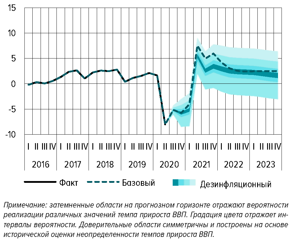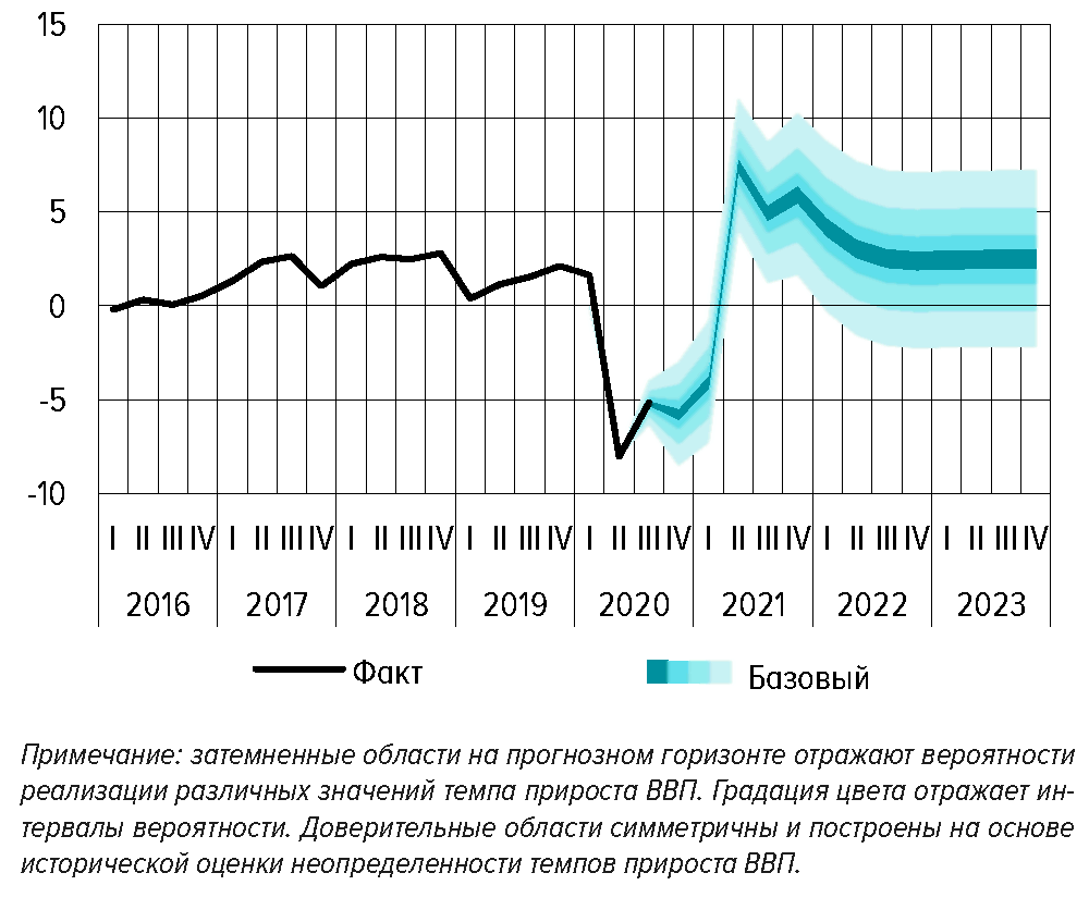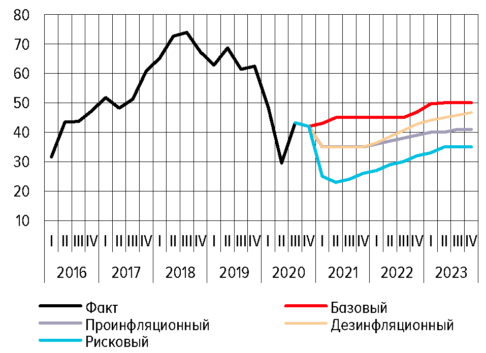 Базовый сценарий предусматривает ослабление эпидемиологических рисков, плавное восстановление цен на нефть до 50 долл. США/барр, восстановление потребительской активности домохозяйств и инвестиционной активности.