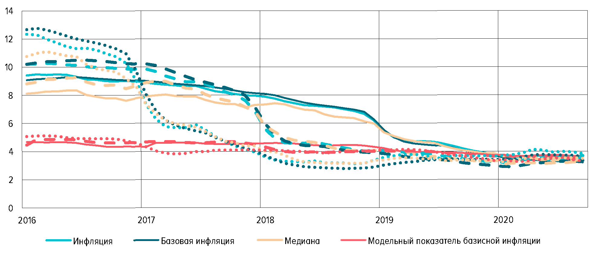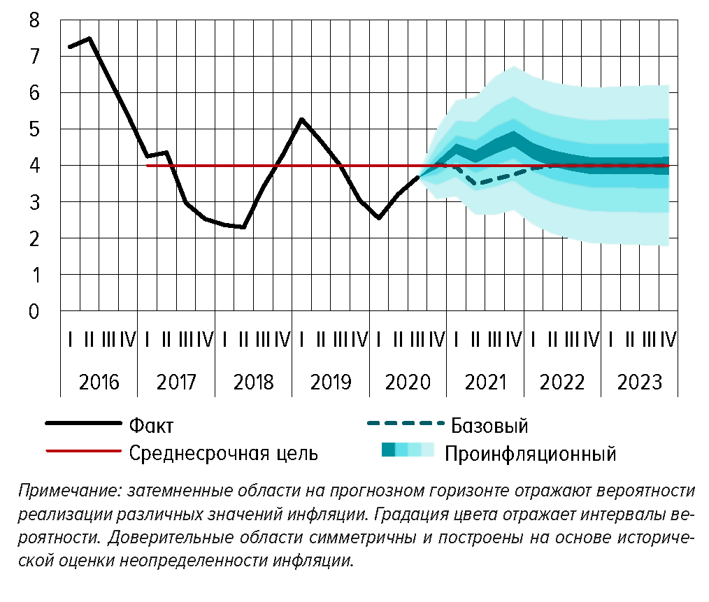 Банк России стремится поддерживать инфляцию вблизи 4% постоянно. В случае действия на прогнозном горизонте факторов, которые могут привести к отклонению инфляции от цели, Банк России оценивает их причины и продолжительность возможного влияния на инфляцию и исходя из этого принимает решения об использовании мер денежно-кредитной политики для недопущения ее отклонения от цели. В ситуации же отклонения инфляции от цели скорость возвращения к ней выбирается Банком России с учетом масштаба отклонения и влияния решений по ключевой ставке на экономическую активность. Кроме того, принимая эти решения, Банк России учитывает риски для финансовой стабильности.