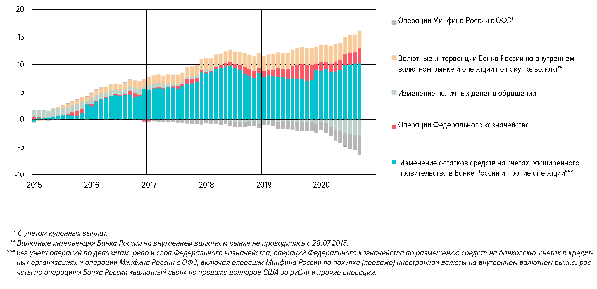 Плавающий валютный курс действует как "встроенный стабилизатор", позволяя экономике подстроиться под изменение внешних условий и сглаживая их влияние3. Следуя режиму плавающего валютного курса, Банк России не проводит интервенций на внутреннем валютном рынке в целях поддержания определенного уровня курса или скорости его изменения. При этом Банк России может проводить операции с иностранной валютой на внутреннем рынке для пополнения (использования) международных резервов в связи с применением Минфином России бюджетного правила, а также в целях противодействия факторам финансовой нестабильности.