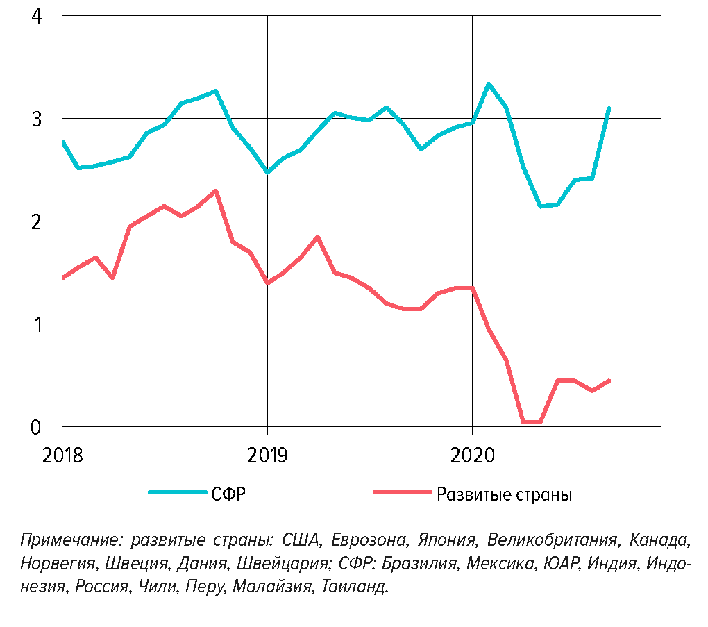 Денежно-кредитная политика крупнейших центральных банков влияет на цены финансовых активов на мировых рынках, склонность инвесторов к риску, страновые риск-премии и динамику курсов валют. В условиях отсутствия ограничений на трансграничные потоки капитала заимствования российских экономических агентов на внешних рынках, вложения отечественных инвесторов за рубежом, а также инвестиции иностранных инвесторов в российскую экономику зависят от ситуации на мировых финансовых рынках, в том числе в странах с формирующимися рынками, и сравнительной привлекательности российских финансовых активов по отношению к другим странам. Банк России формирует макроэкономический прогноз, учитывая многостороннее влияние мер экономической политики в развитых и развивающихся странах на ситуацию в российской экономике.