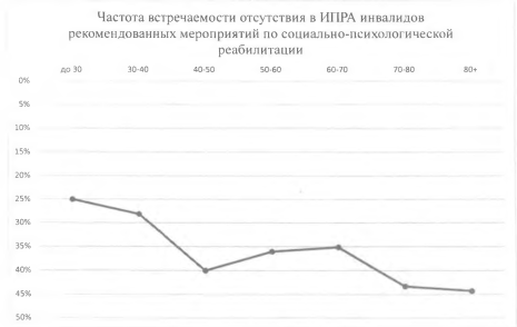 В ходе анализа 2400 индивидуальных программ реабилитации или абилитации инвалидов (детей-инвалидов) в части мероприятий по социально-психологической реабилитации или абилитации, которые были разработаны в ряде субъектов Российской Федерации, выявлено отсутствие рекомендаций по осуществлению мероприятий социально-психологической реабилитации или абилитации. В частности, рекомендации в части мероприятий по социально-психологической реабилитации отсутствовали в 35% ИПРА инвалидов и 1% ИПРА детей-инвалидов. Следует уточнить, что при отсутствии подобных рекомендаций инвалид остается лишен всех перечисленных услуг по социально-психологической реабилитации, в том числе психологического консультирования.