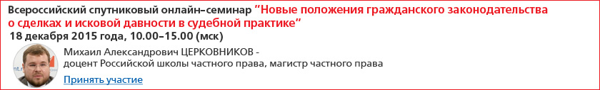 .jpg) | 14 января 2015 года Всероссийский спутниковый онлайн-семинар ГАРАНТ на тему: "Недвижимость и иные объекты гражданских прав. Новеллы и судебная практика" | Спикер: Бевзенко Роман Сергеевич – к. ю. н., партнер юридической фирмы "Пепеляев Групп", профессор Российской школы частного права. Принять участие можно очно или в записи, находясь в любой точке страны! Регистрация |
