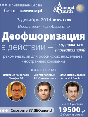 3 декабря 2014 г., Москва, юридическая компания Amond & Smith Ltd приглашает на бизнес-семинар "Деофшоризация в действии – как удержаться в правовом поле? Рекомендации для российских владельцев иностранных компаний". Подробнее
